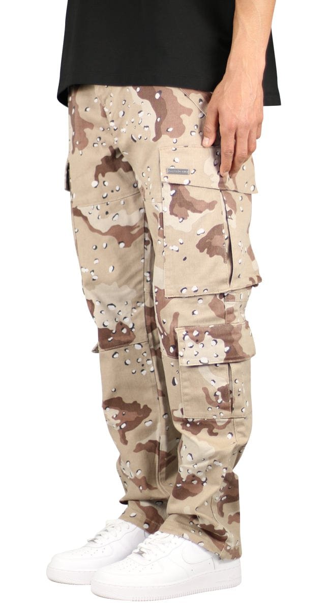 These cargo pants offer an oversized fit, complete with a traditional jeans button and belt loops for a classic look. They feature eight utility pockets for maximum storage and adjustable bungee cords at the ankles for a customizable fit.