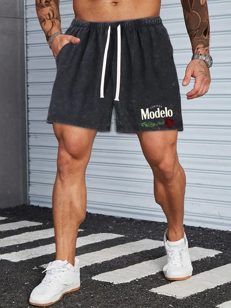 Men’s Vintage Washed Casual Shorts with Rose Print – 100% Cotton 290gsm Elastic Drawstring Waistband